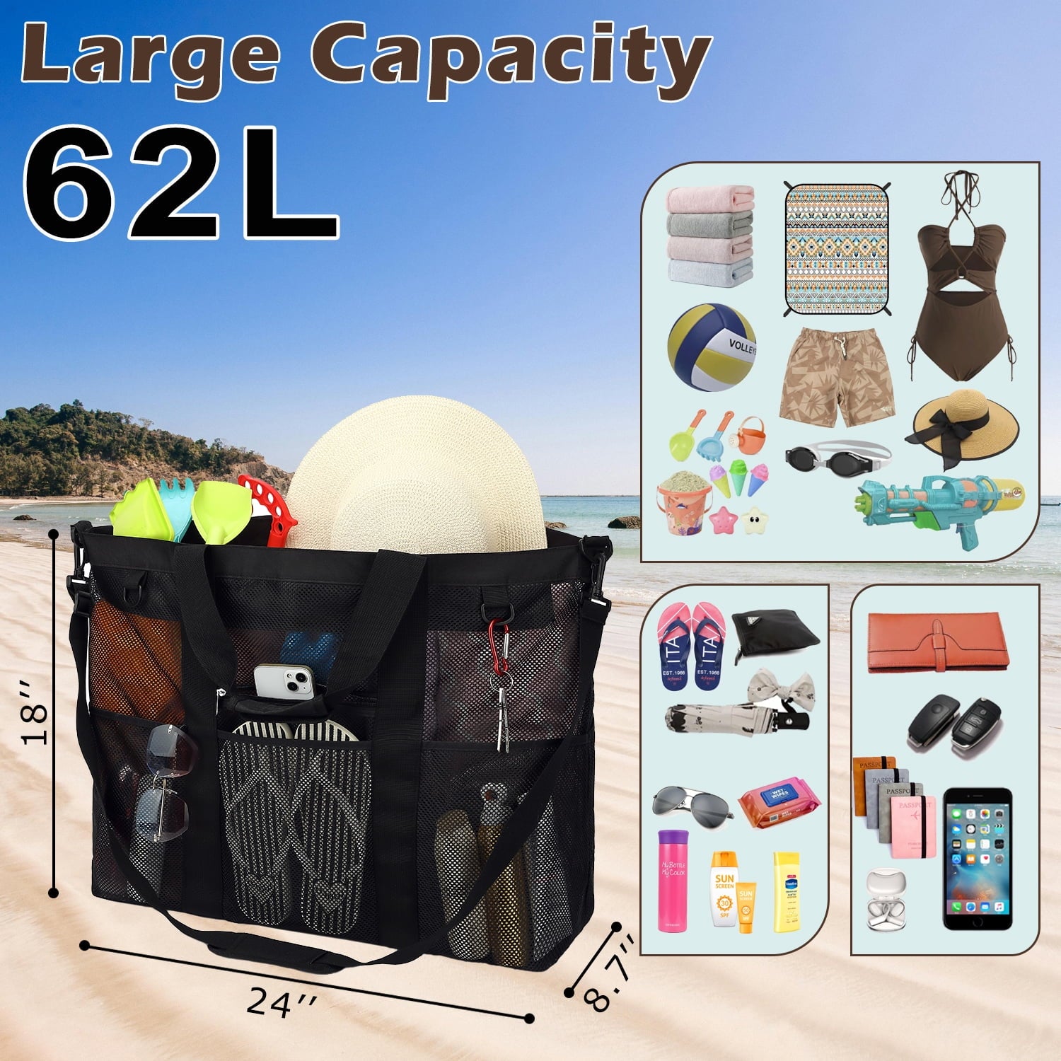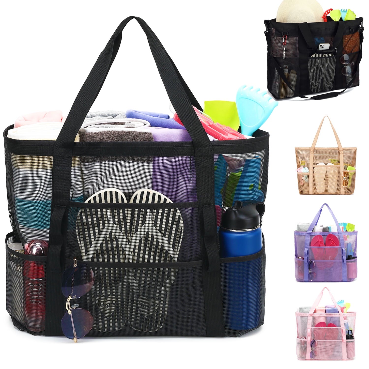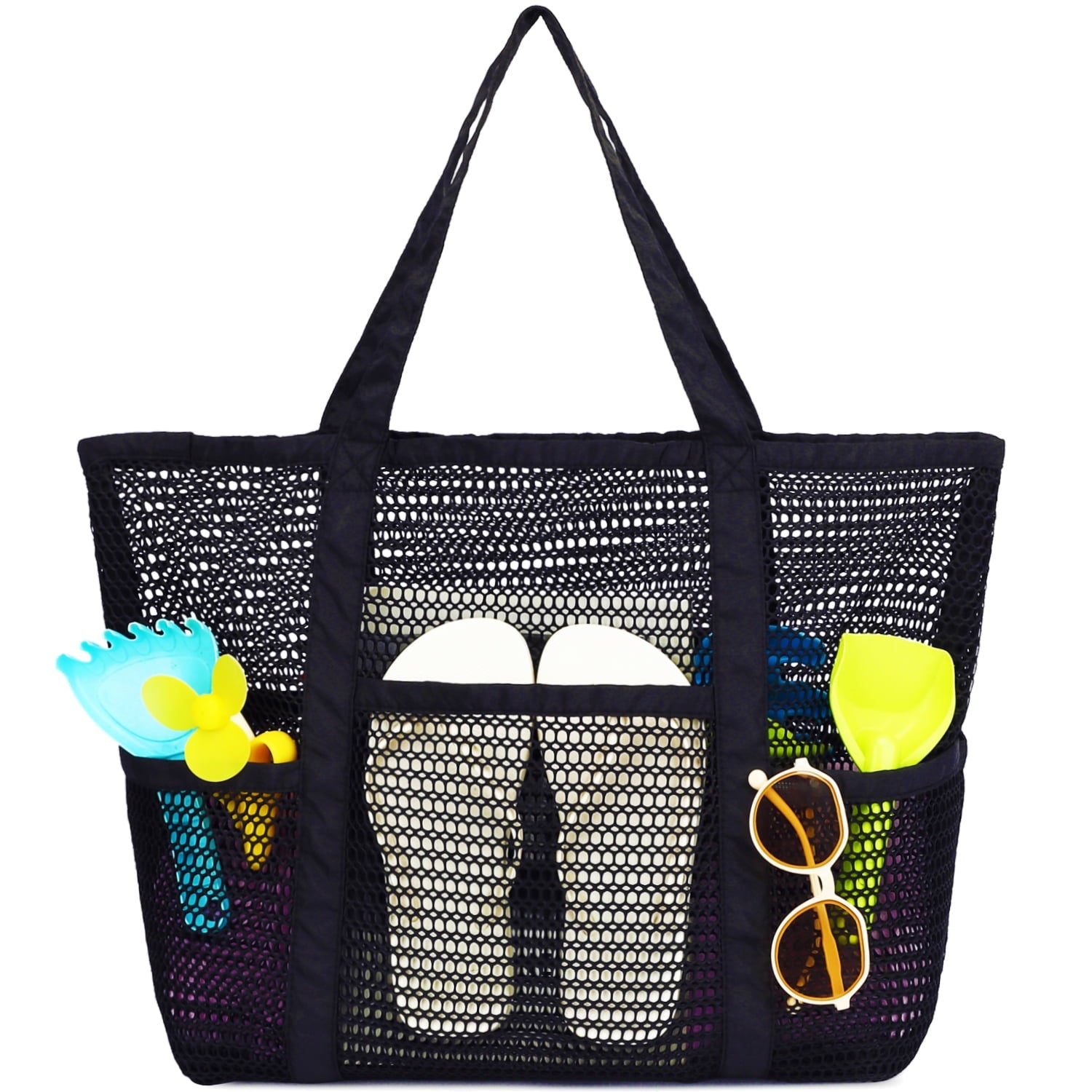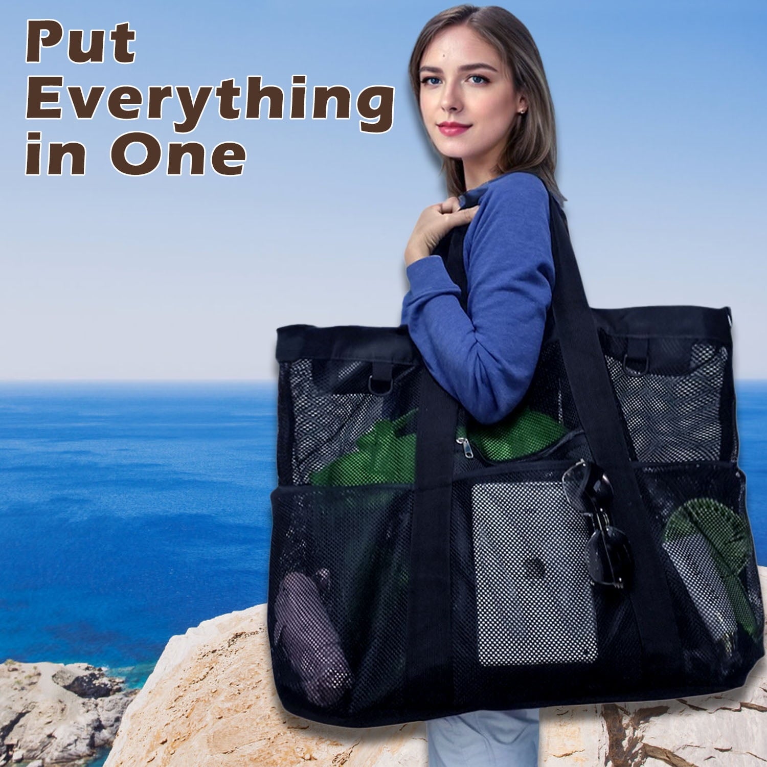 Fammart Mesh Beach Bag, Large Beach Tote with Zipper Pocket for Family Pool Bag for Toys & Vacation Essentials, Black