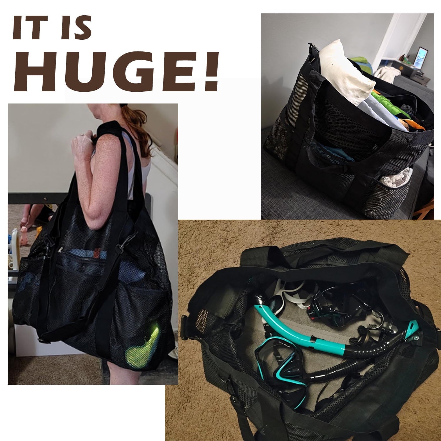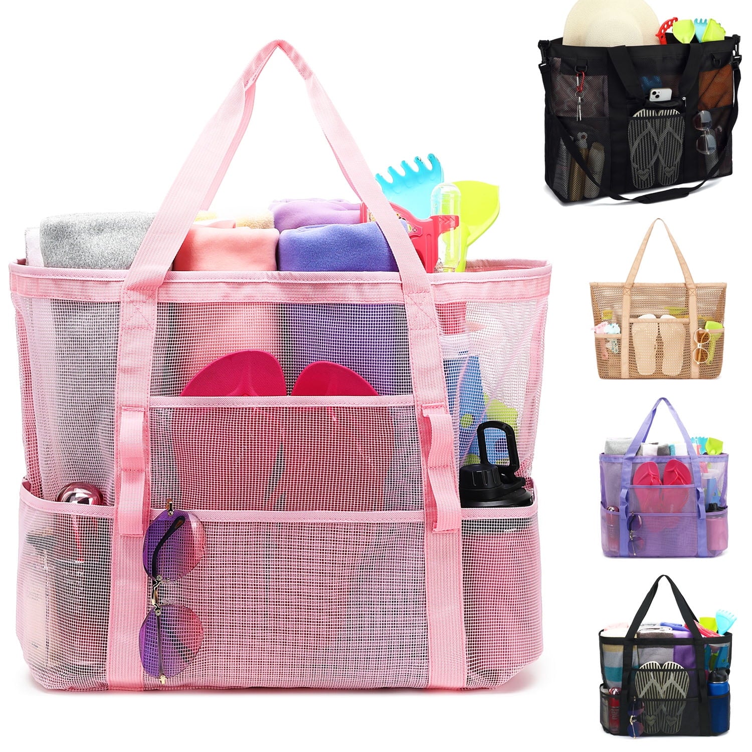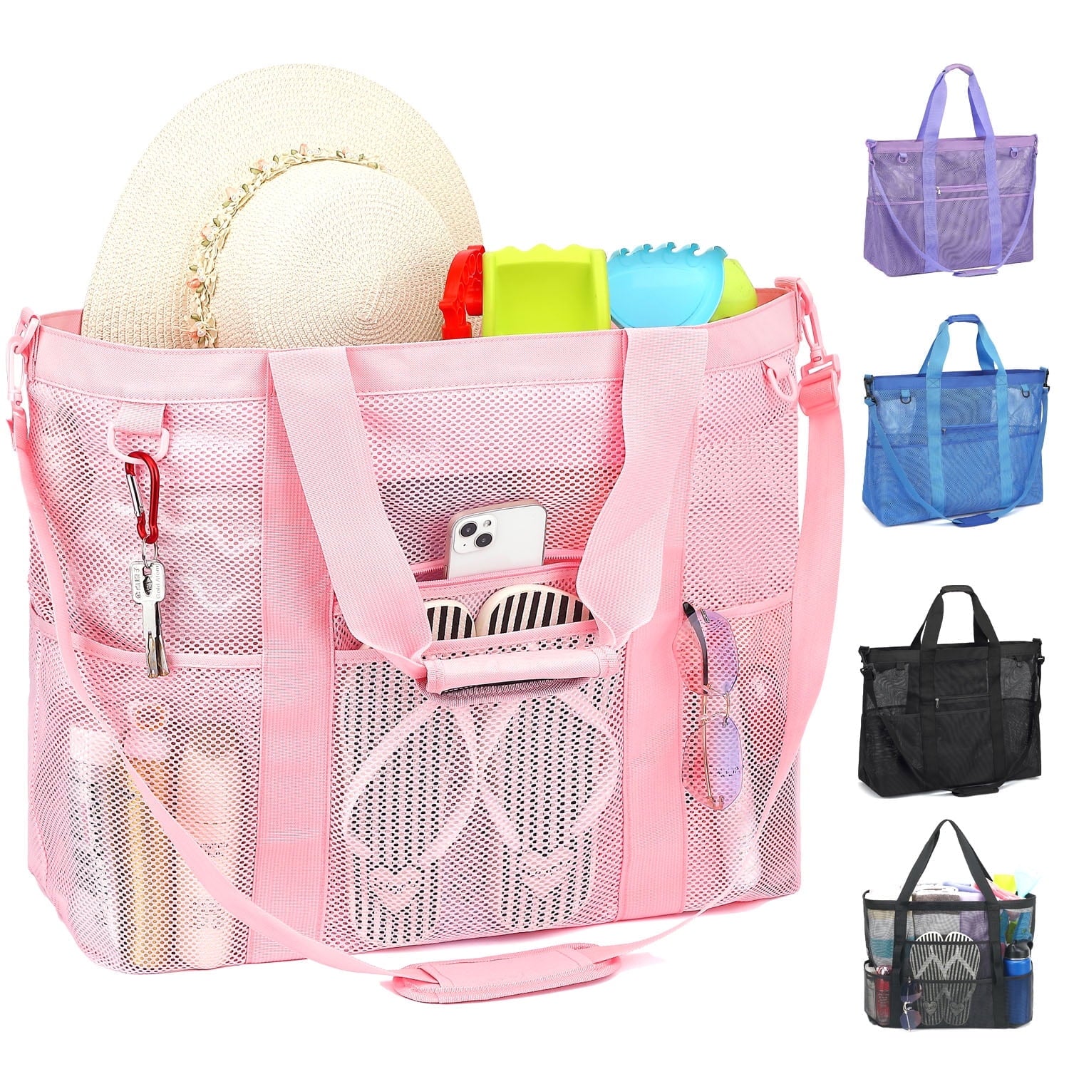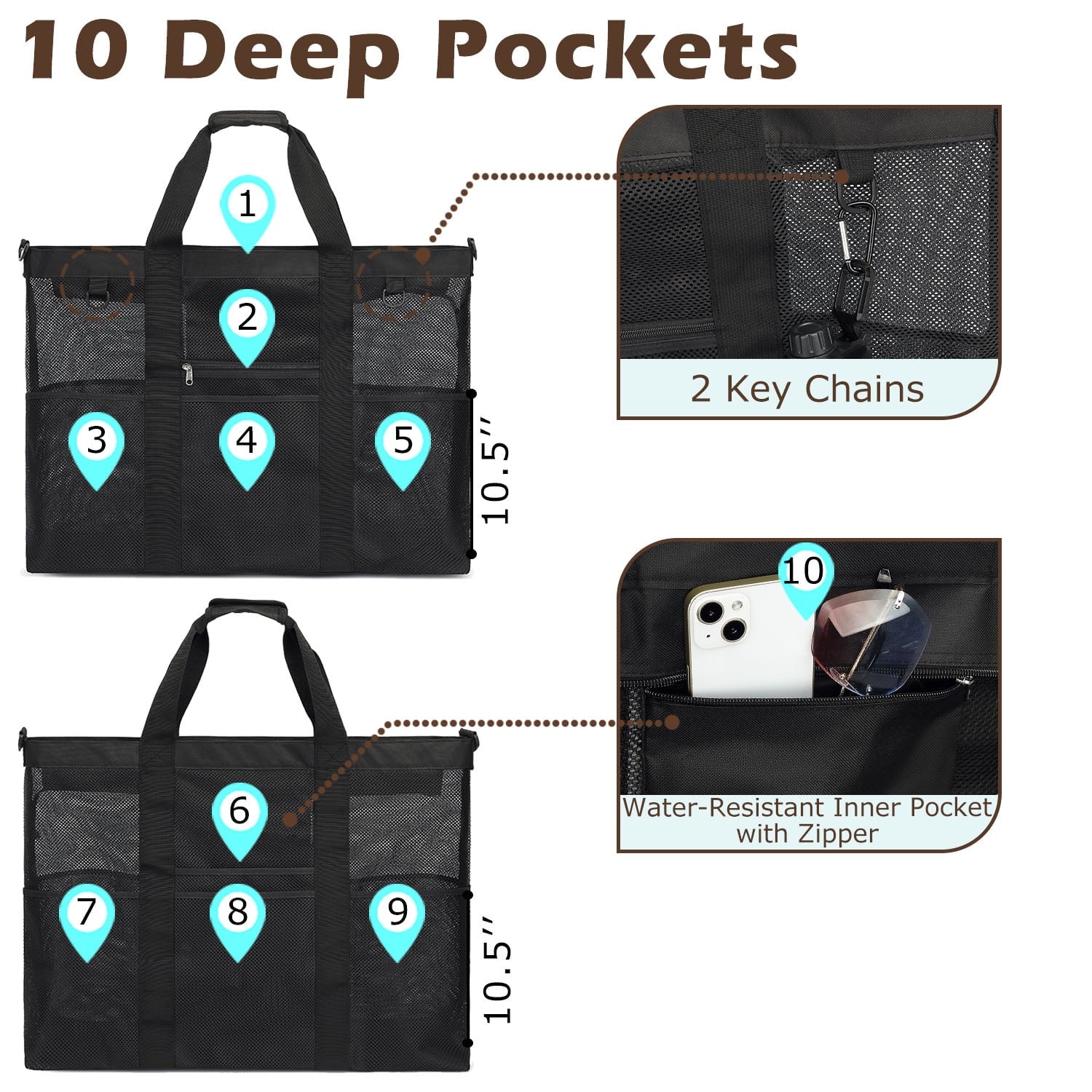 Fammart Mesh Beach Bag, Large Beach Tote with Zipper Pocket for Family Pool Bag for Toys & Vacation Essentials, Black