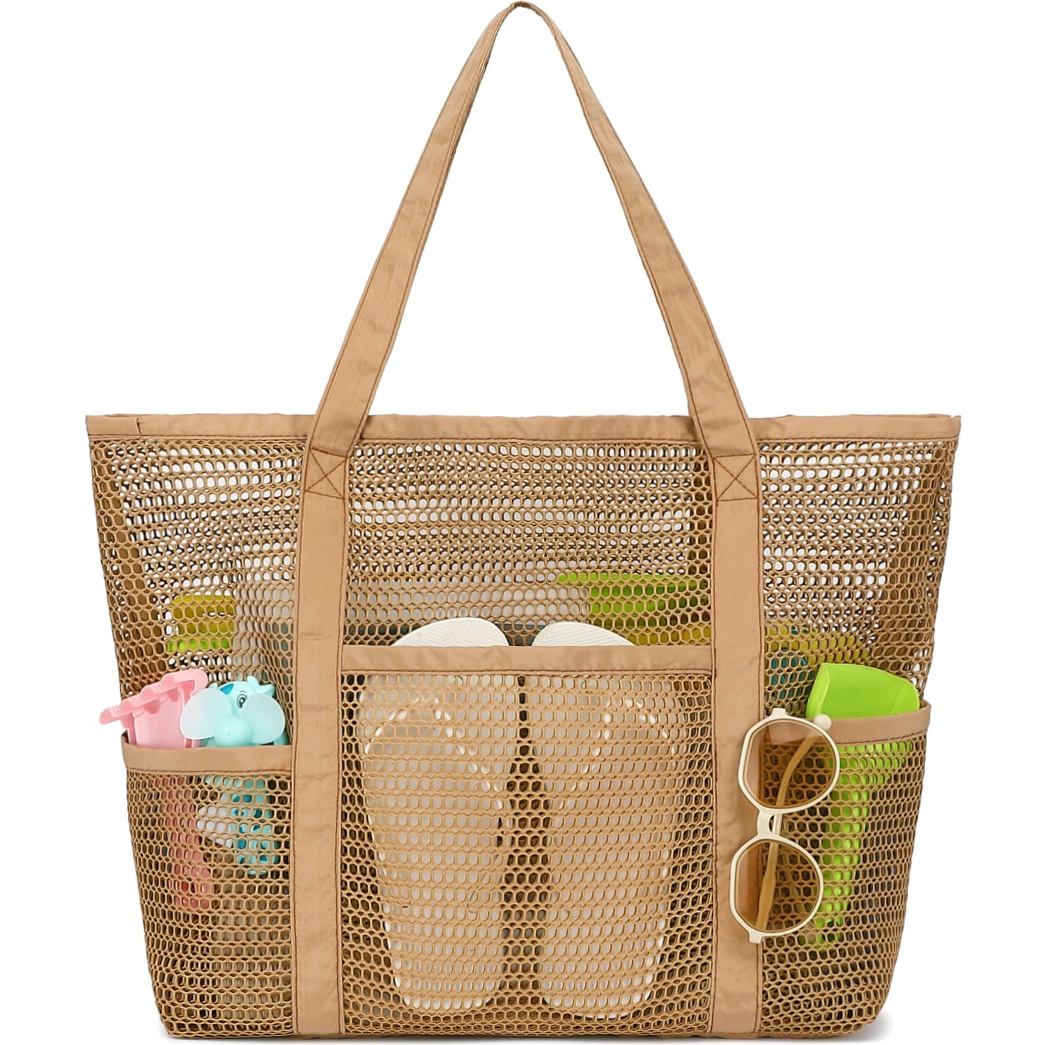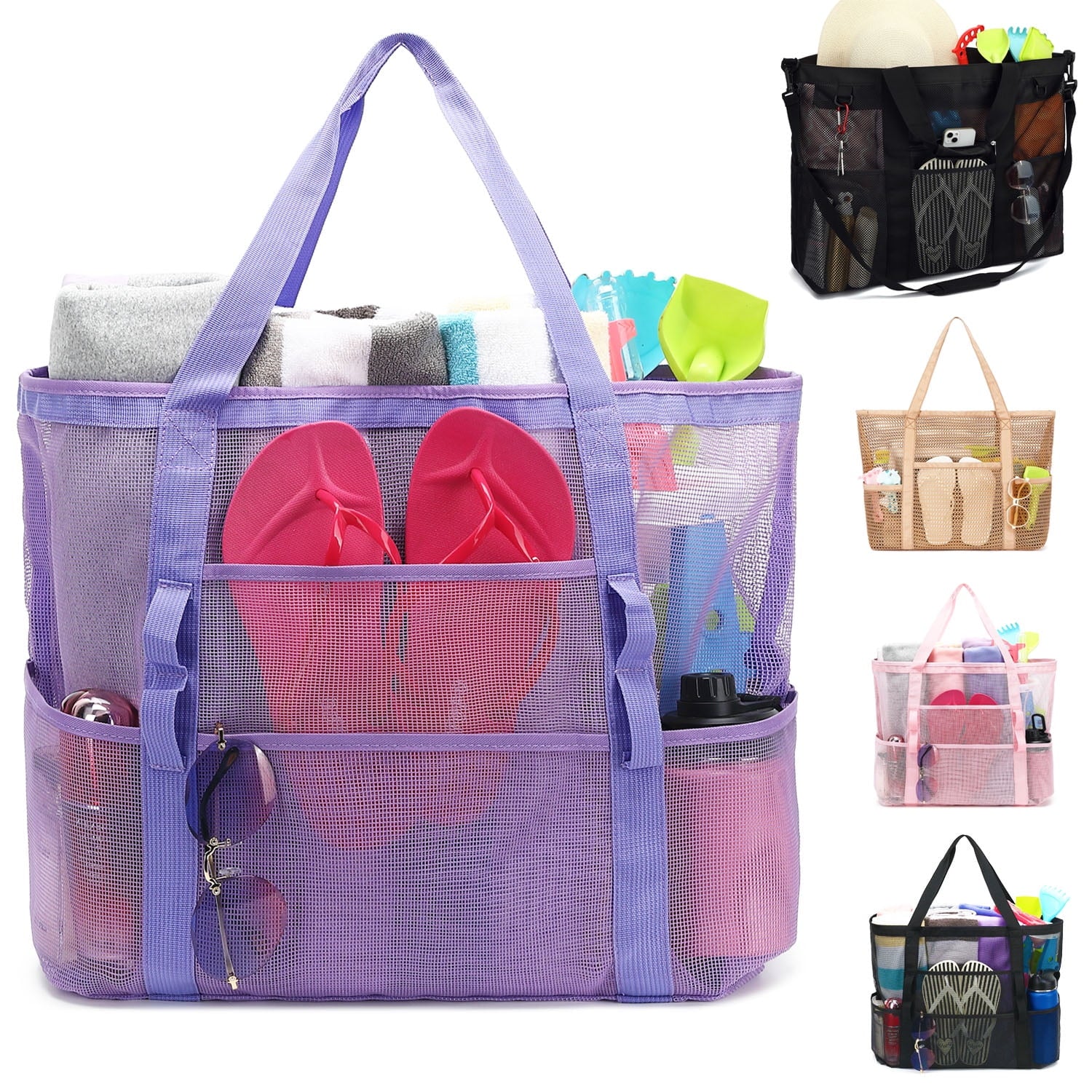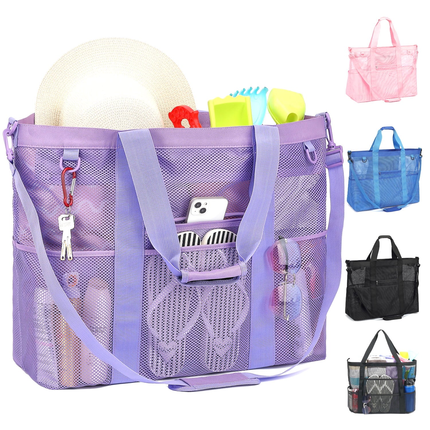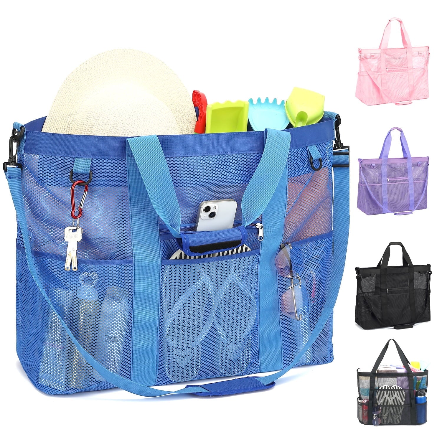 Fammart Mesh Beach Bag, Large Beach Tote with Zipper Pocket for Family Pool Bag for Toys & Vacation Essentials, Black