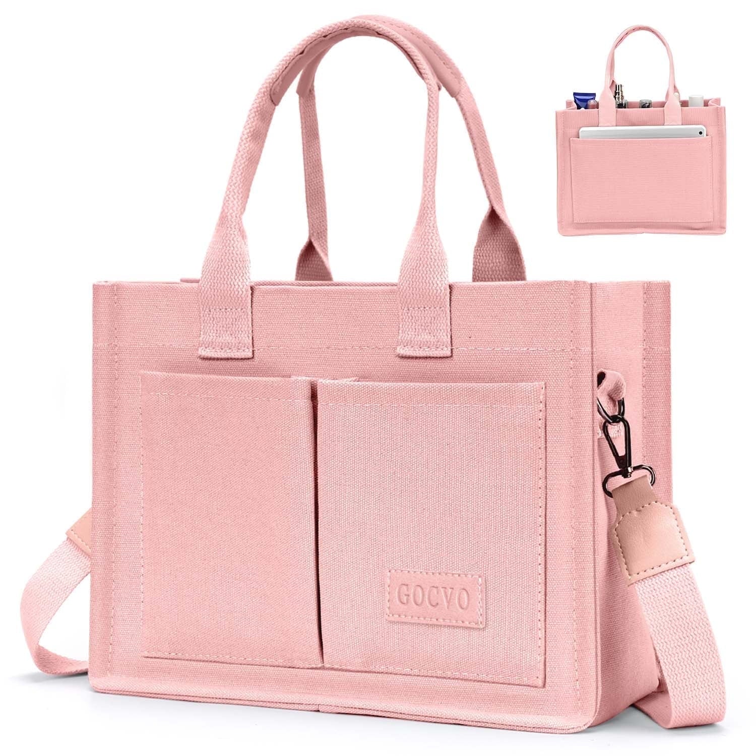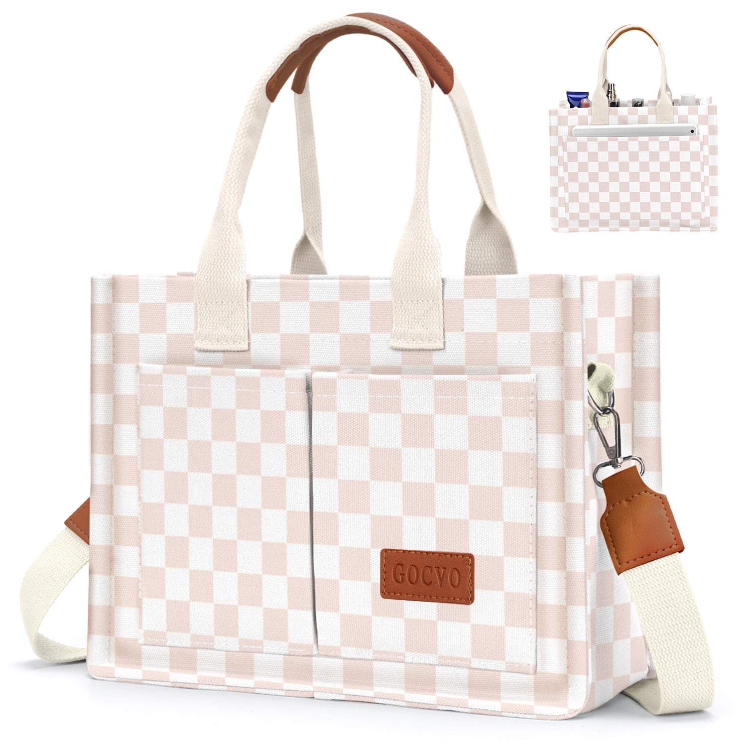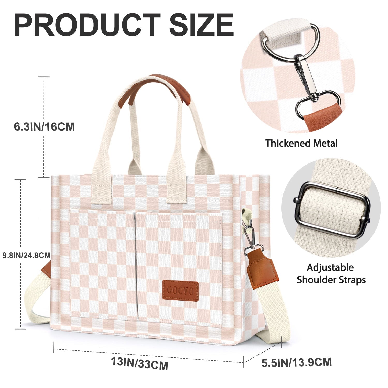 Gocvo Canvas Tote Bag for Women, Large Multi-Pocket Shoulder Handbag, Crossbody Messenger Bag, Pink Plaid