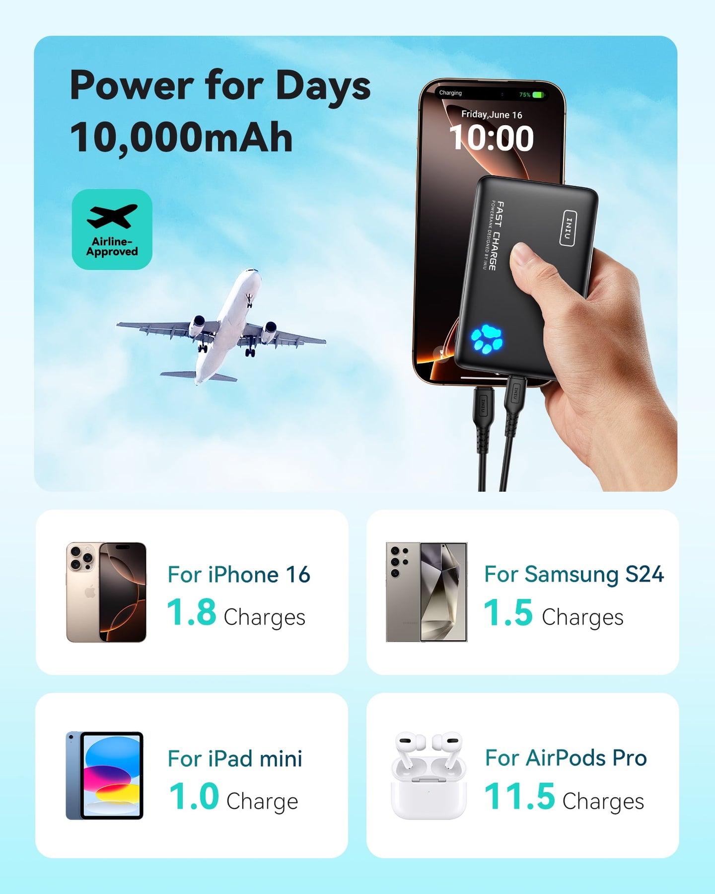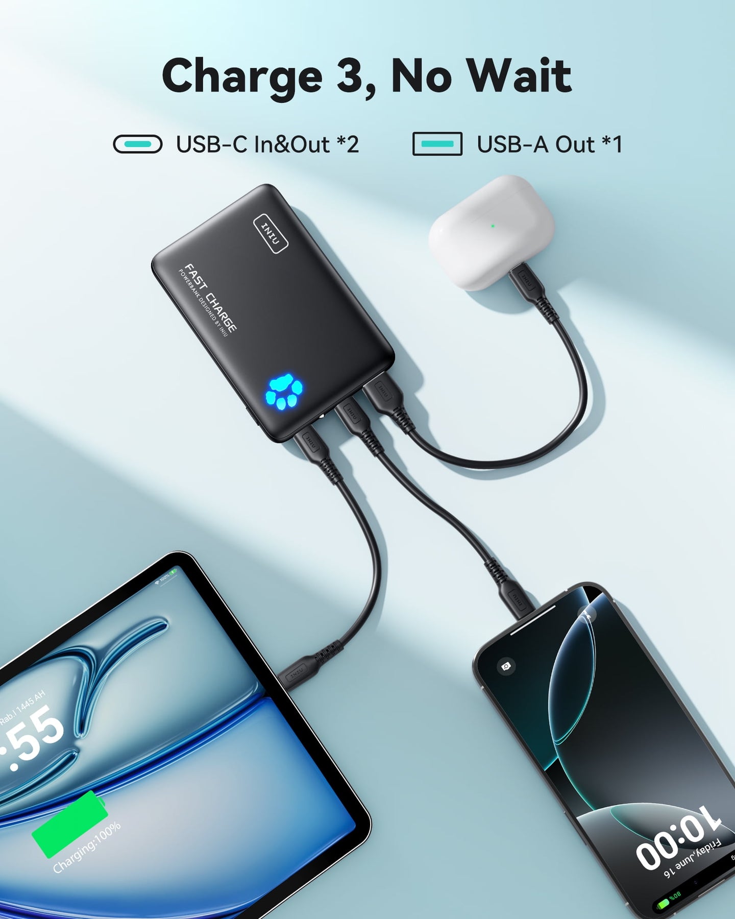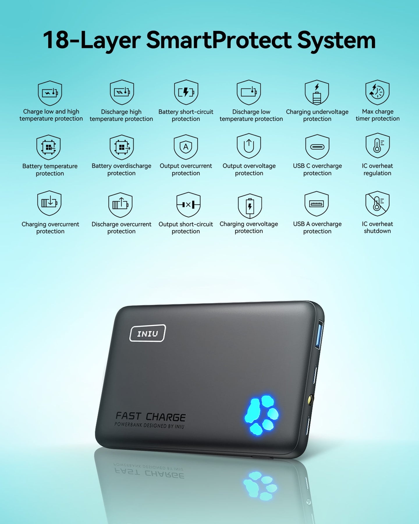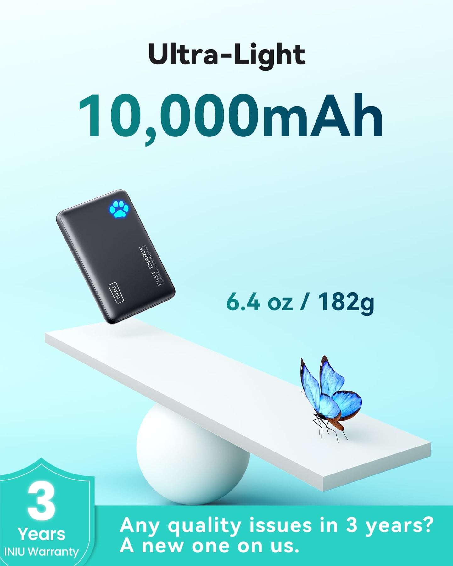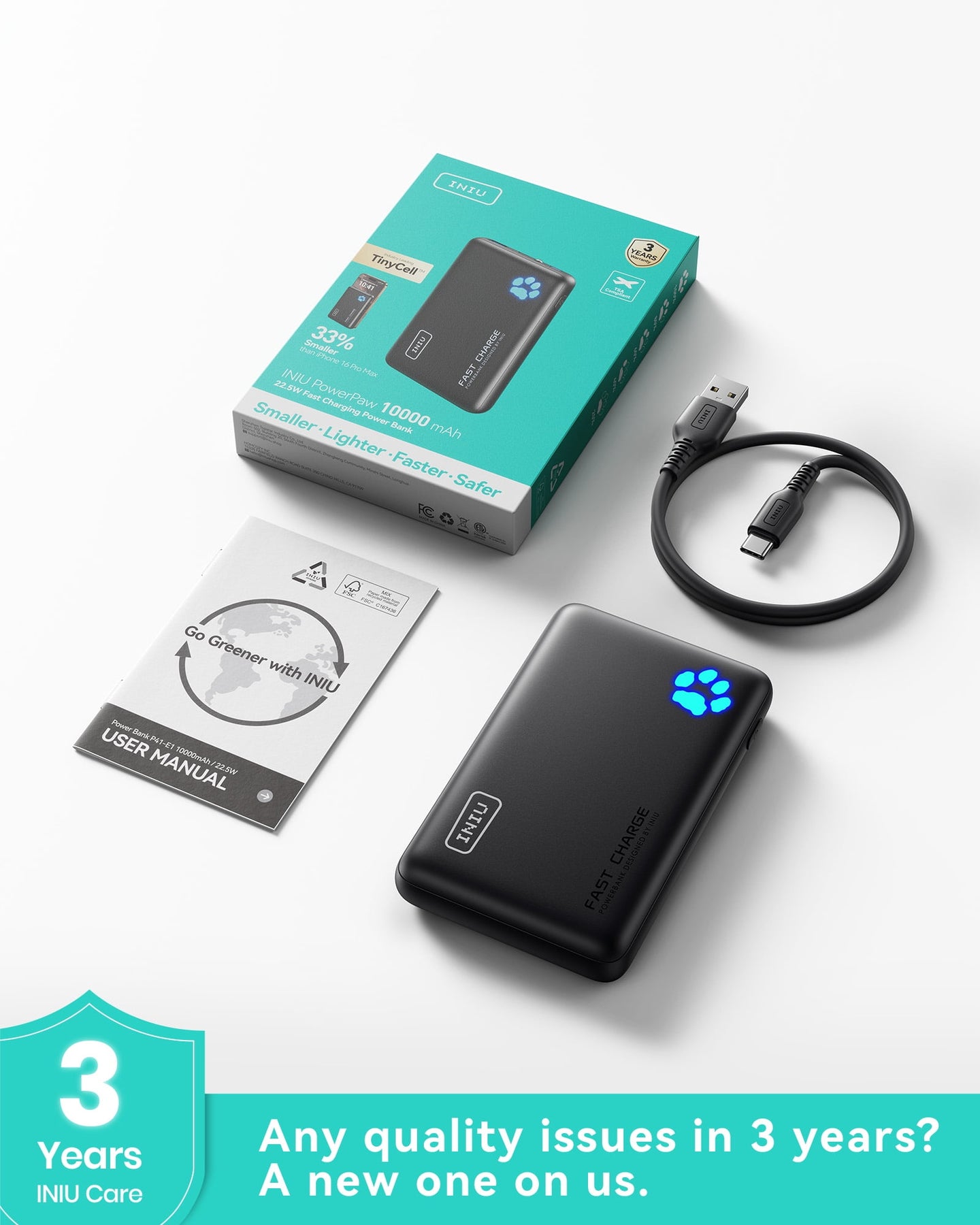INIU PowerPaw 10K Power Bank, Slimmest 10,000mAh PD 22.5W Fast Charging Portable Charger Battery Pack with Dual USB C & USB A Ports for iPhone, Samsung, Google Pixel, Tablets, AirPods, etc.