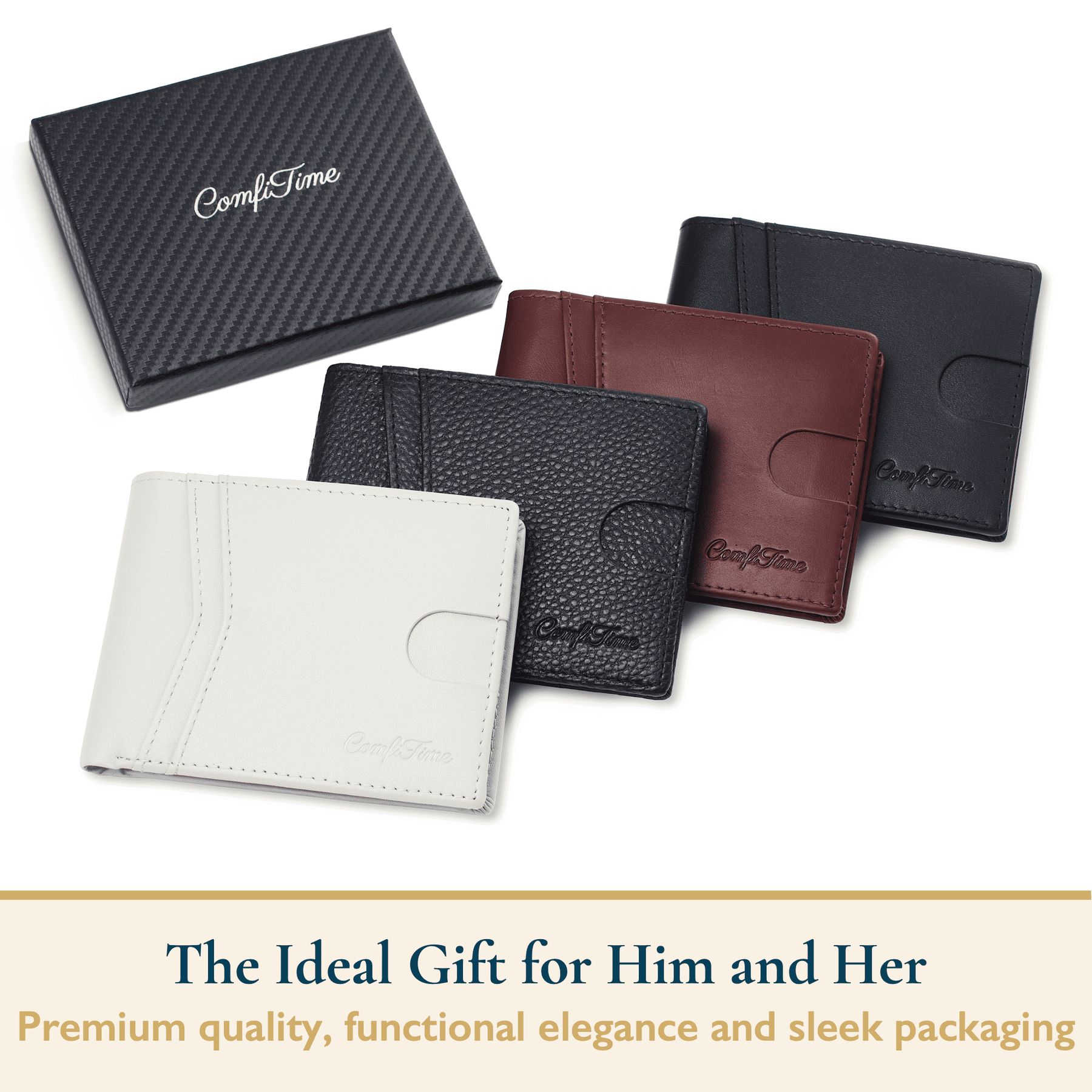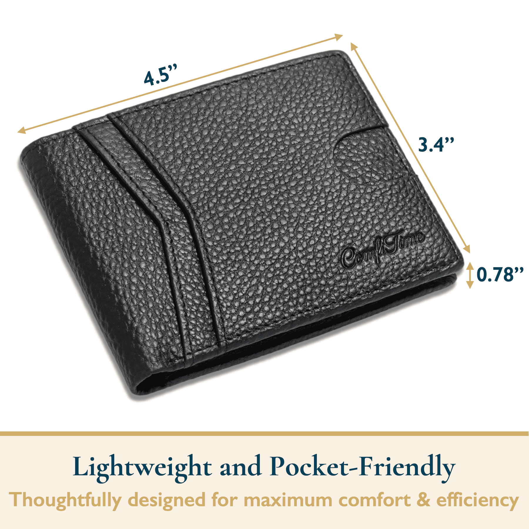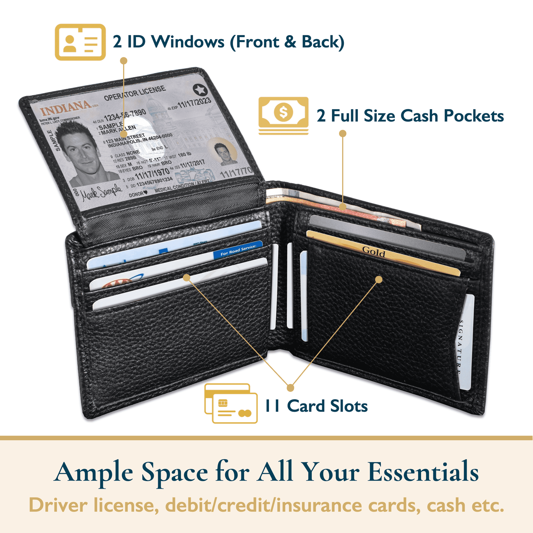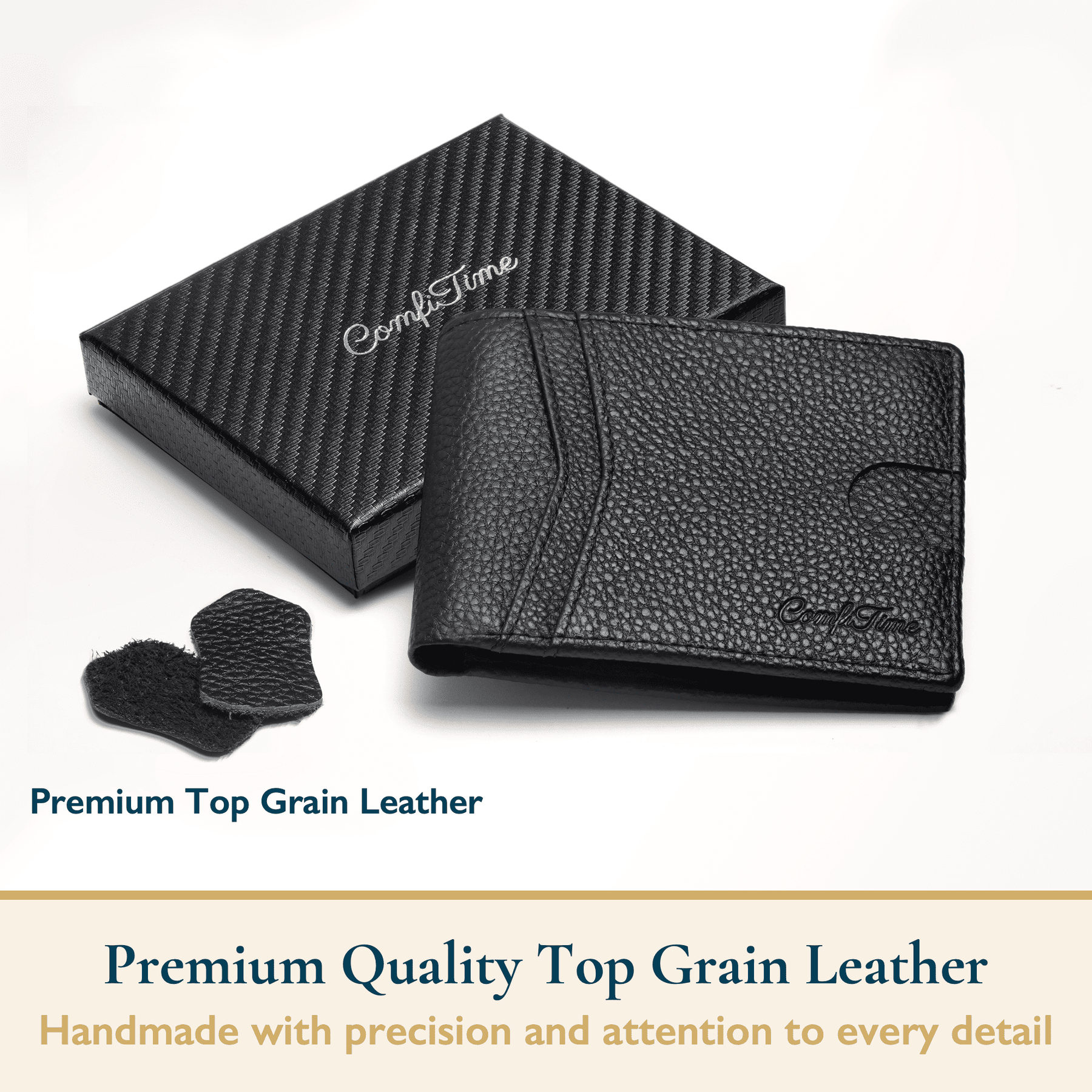 ComfiTime Top Grain Leather RFID Bifold Wallet–Handcrafted Billfolds for Men & Women, 2 ID Windows, 11 Card Slots, 2 Cash Pockets, Genuine Leather Front Pocket Travel Wallet, Gift Box, Pebbled Black
