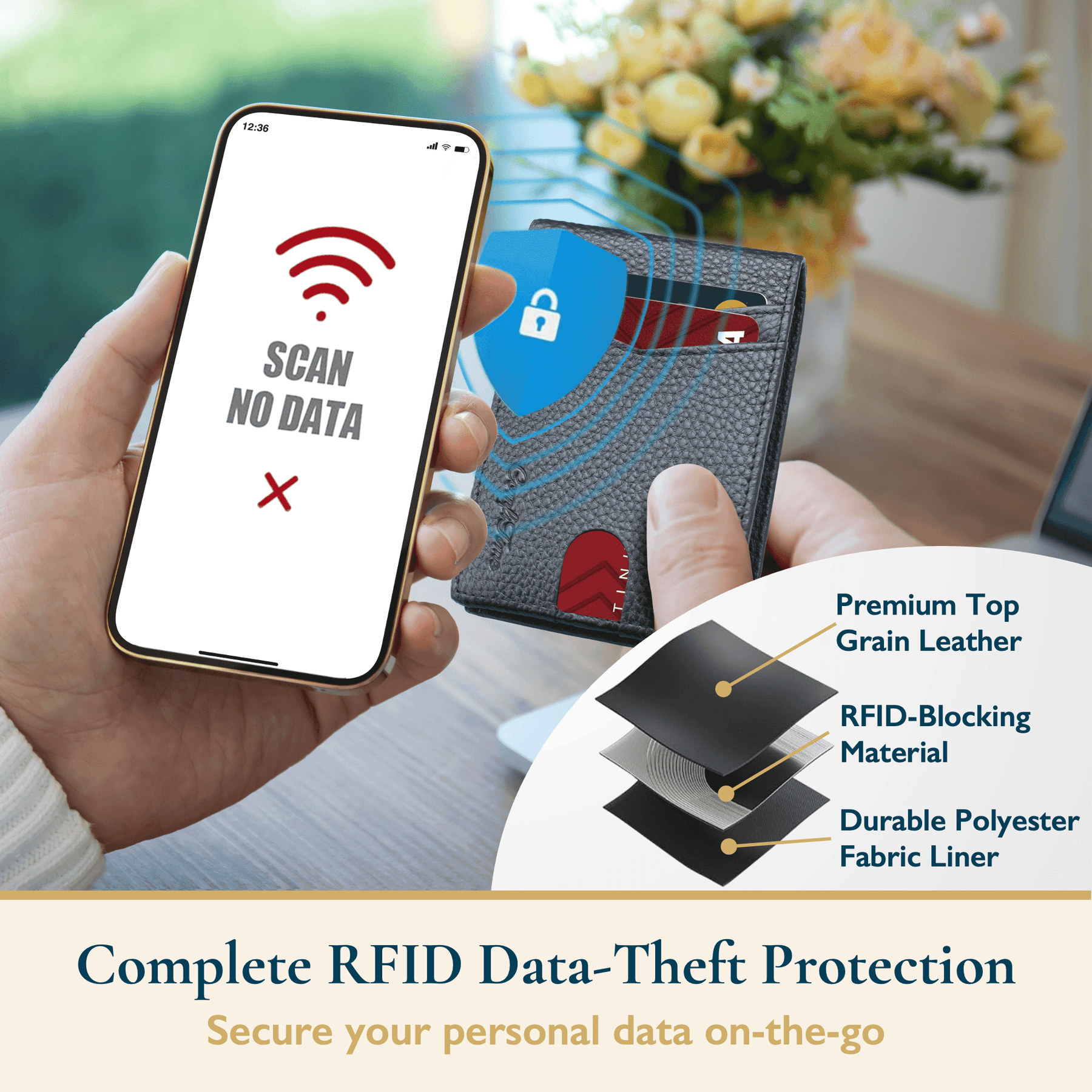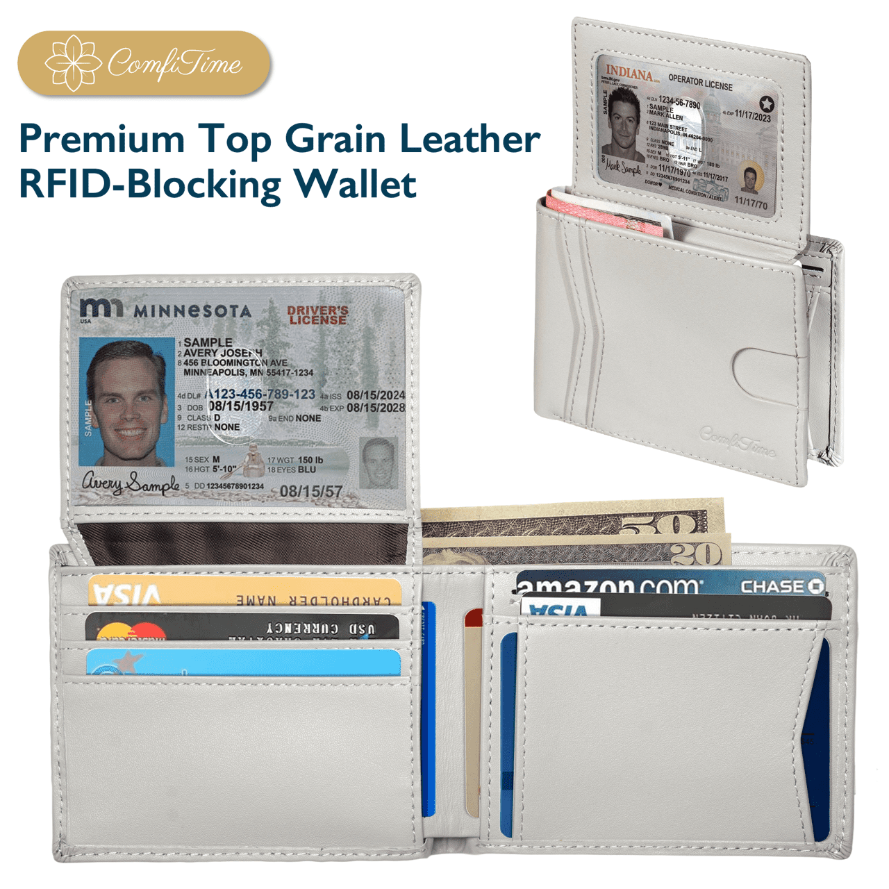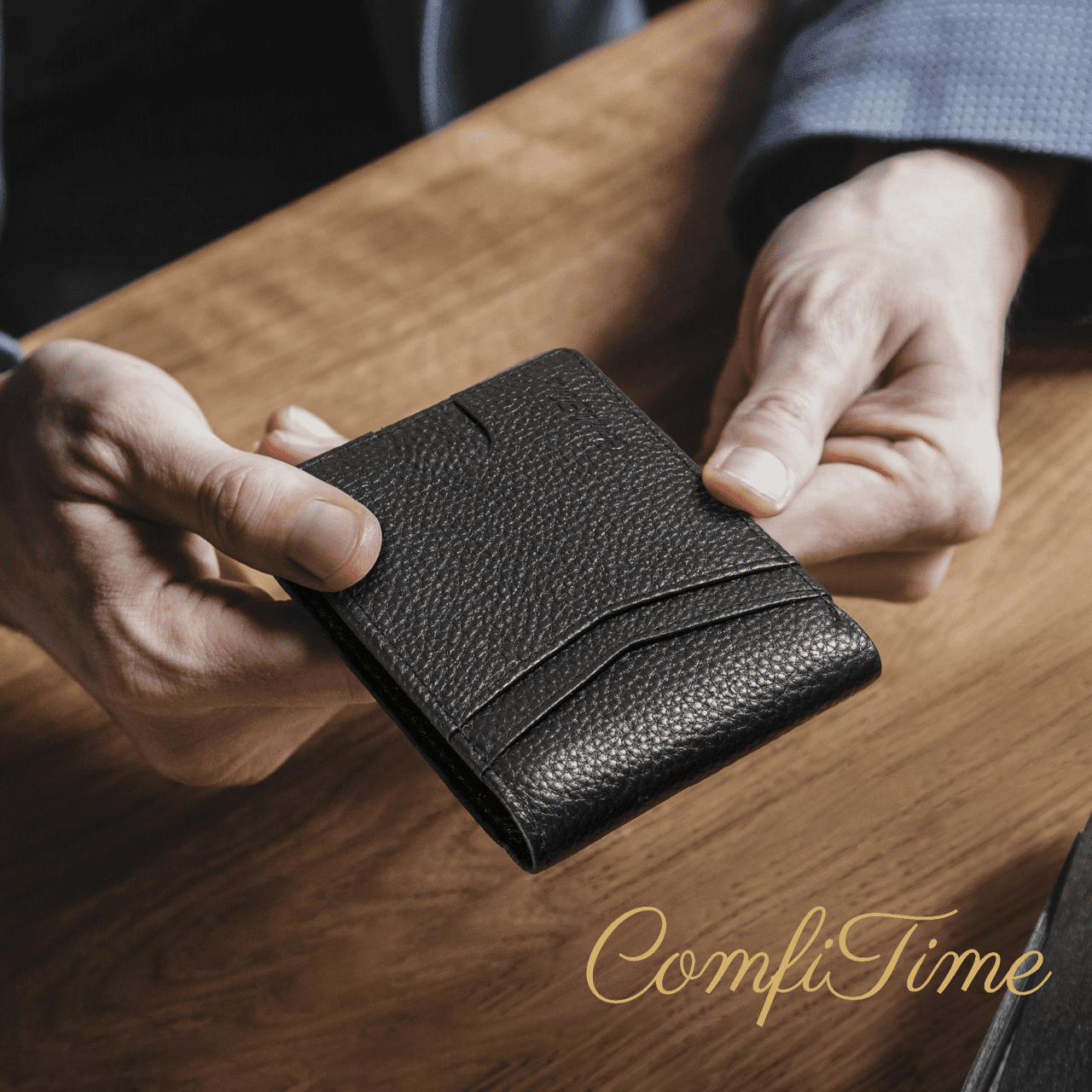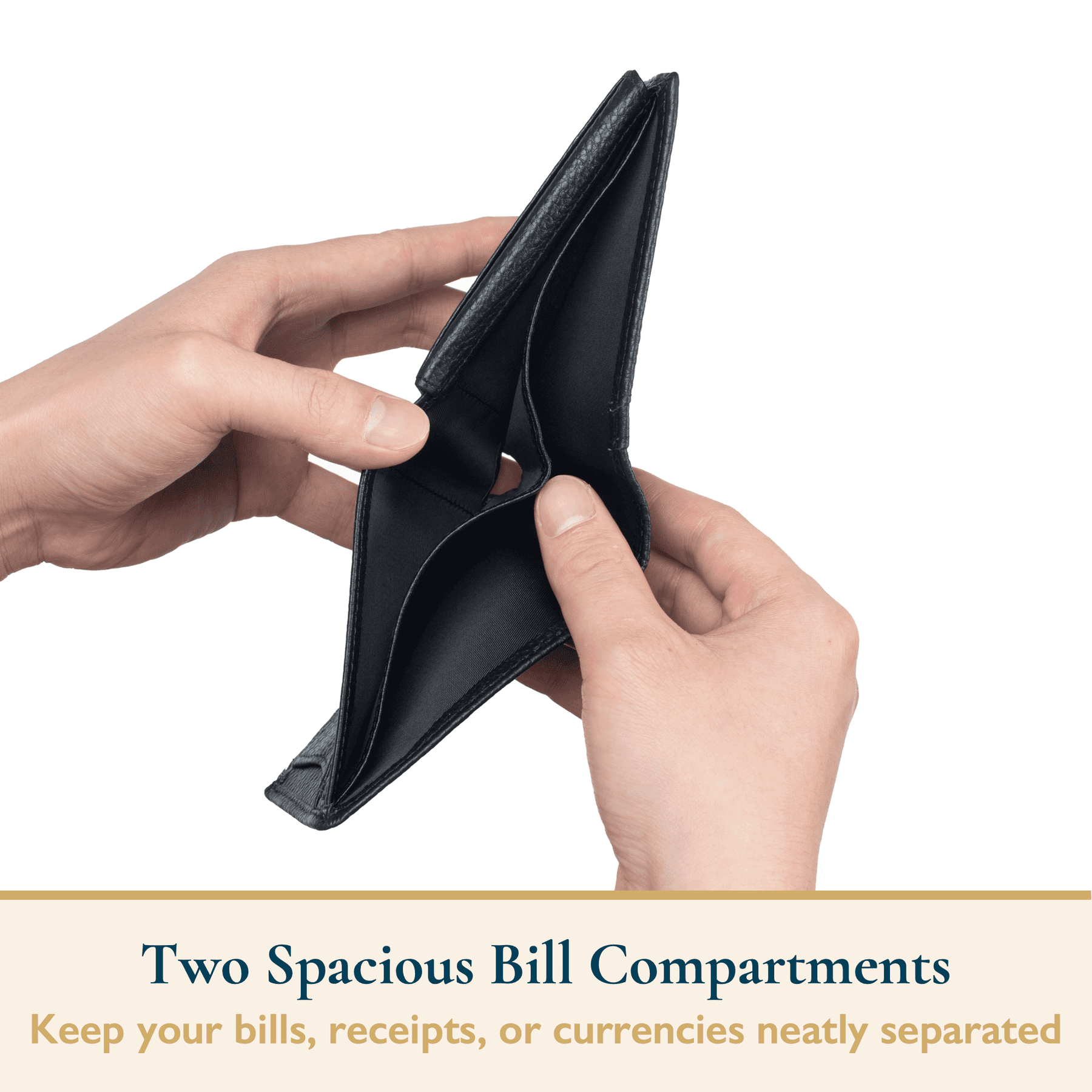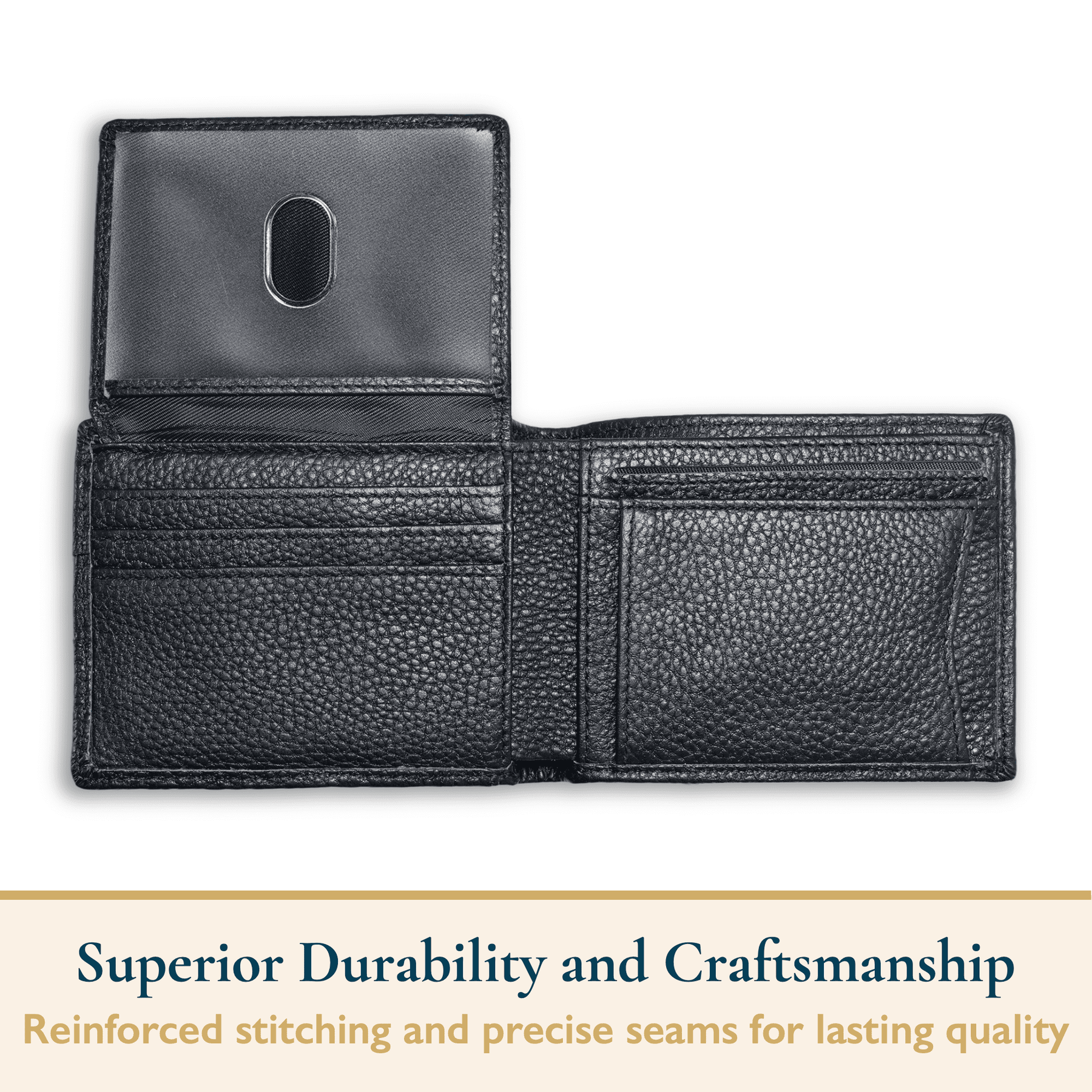 ComfiTime Top Grain Leather RFID Bifold Wallet–Handcrafted Billfolds for Men & Women, 2 ID Windows, 11 Card Slots, 2 Cash Pockets, Genuine Leather Front Pocket Travel Wallet, Gift Box, Pebbled Black