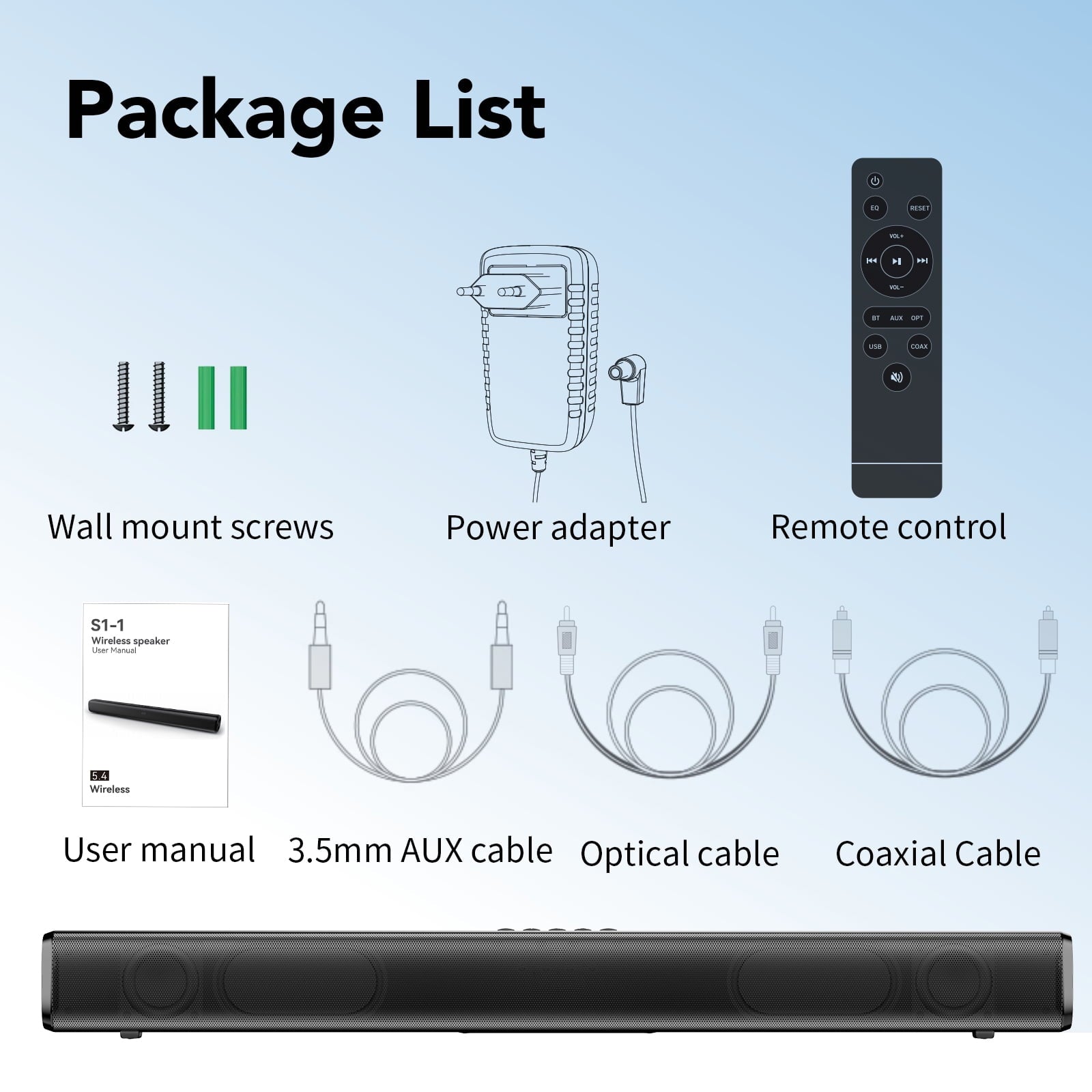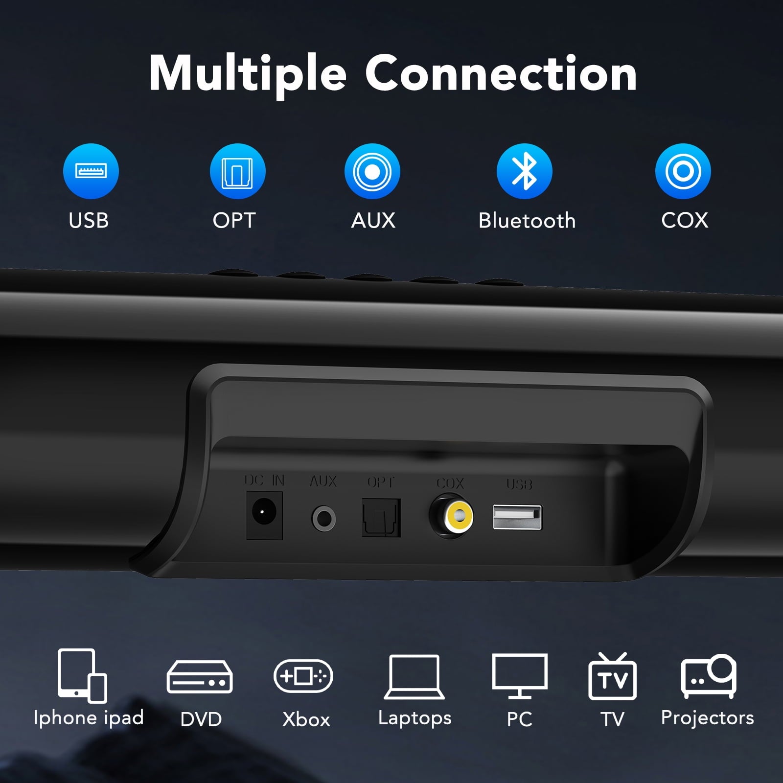 Sound Bar for Smart TV, 60W Soundbar TV Speakers, 2.1 ch Home Theater with Subwoofer Boost, 3 Equalizer Modes, Soundbar for TV/PC/Gaming/Projectors, Bluetooth, OPT, COX, USB & AUX Wall Mountable